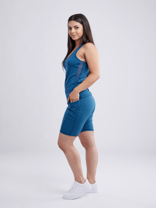 High-Waisted Mid-Thigh Workout Shorts with Hip Pockets & Criss-Cross Design for Women